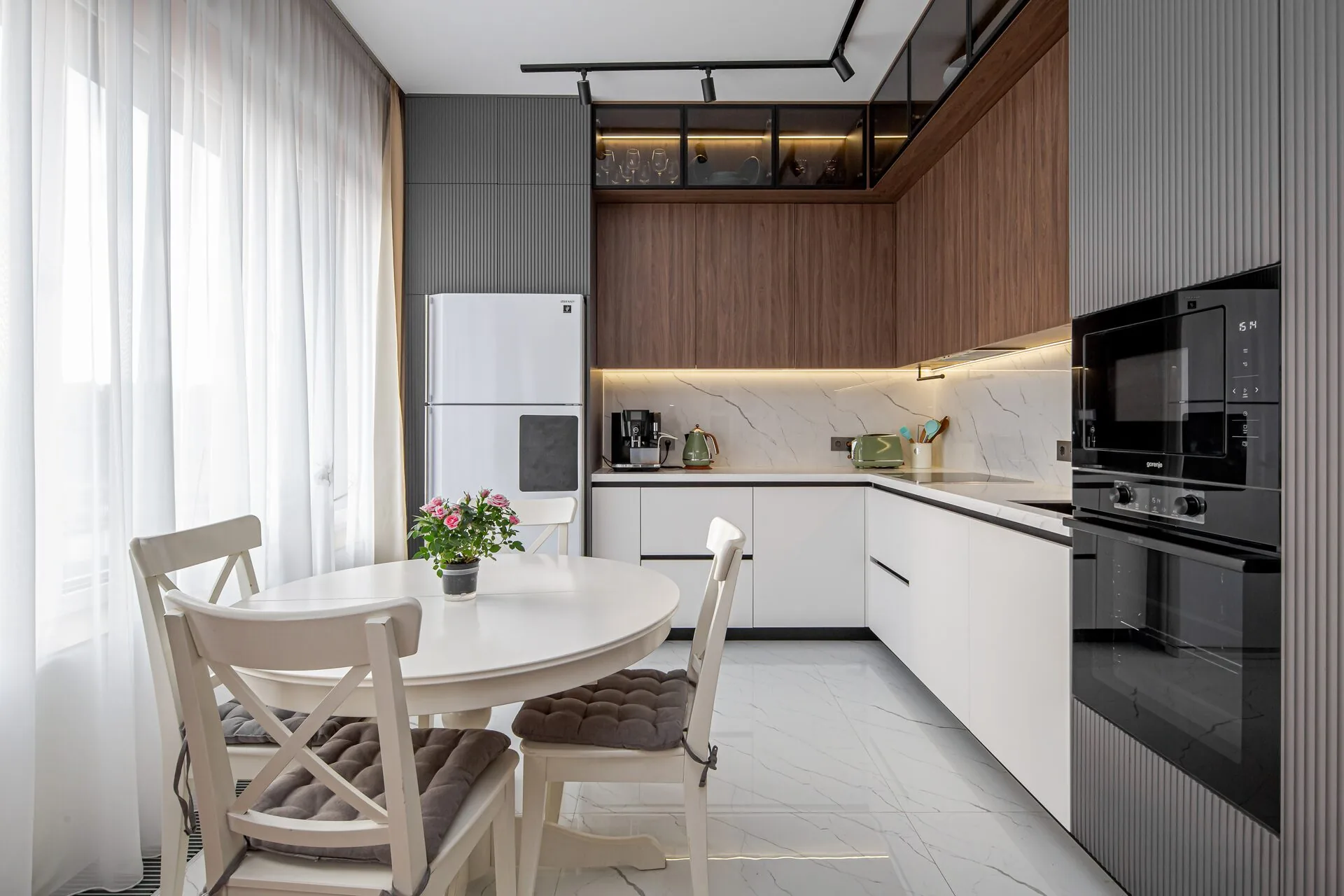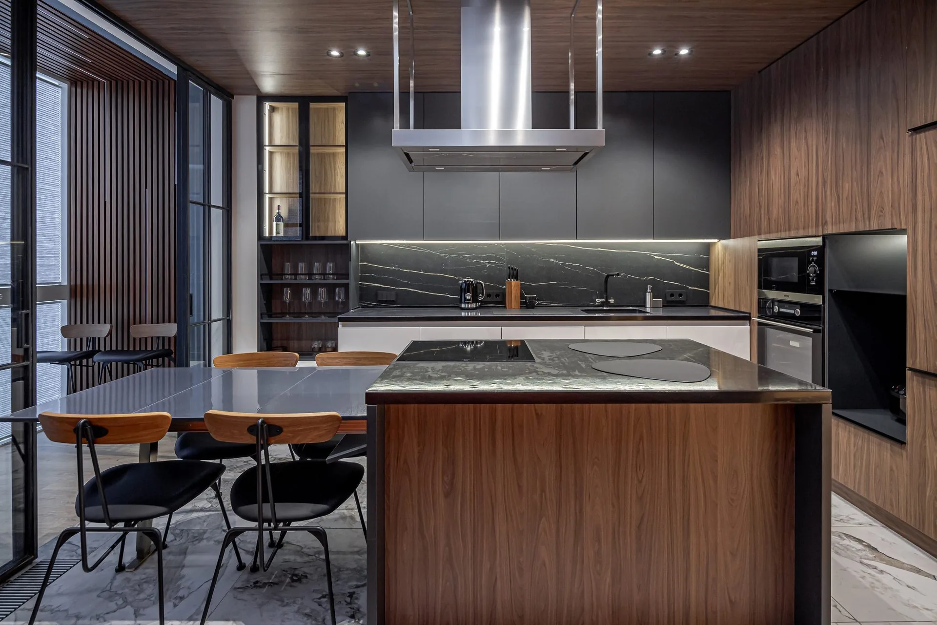 Да, и это наша основная специализация — мы не ставим типовые модули. Радиусные фасады, скошенные углы, ниши под коммуникации, встроенные холодильники и винные шкафы, мебель под мансардные потолки и эркерные окна — всё это делаем регулярно. Производство у нас своё, поэтому ограничены не каталогом, а только физикой материала. Самая нестандартная задача в нашей практике — кухня в виде яхты для одного клиента, делали 6 месяцев. Обычные «нестандарты» — лишние 0–10% к цене и 3–7 дней к сроку.
